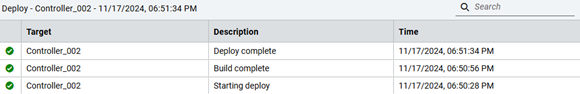 - A green check mark on the left indicates the project deployed successfully to that controller. A yellow warning or a red error appears when there is a problem in the deployment. Hover over a warning or error indicator to see details of unsuccessful deployments.