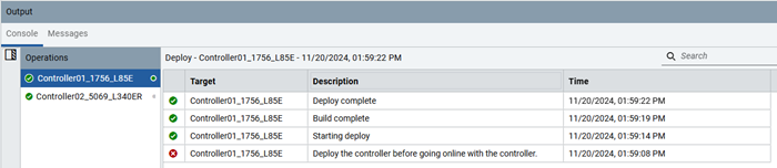 The Output status information reflects operations for the current user in their current FactoryTalk Design Studio session. The information does not persist across sessions and is not shared across users. For example, if User A deployed last week, he or she will not see that operation in the output console even if that was User A's most recent deployment. If User A and User B are both logged in and User B deploys, User A will not see a record of User B's deployment in the output console.