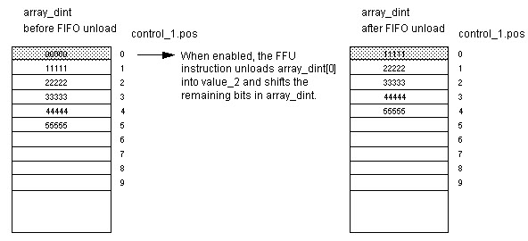 The FFU instruction unloads the value from position 0 (first position) of the FIFO and stores that value in the Destination. The remaining data in the FIFO shifts down one position.