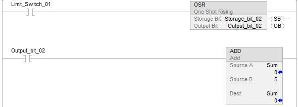 This example shows how an OSR can be used to make one or more instructions edge-triggered. Each time Limit_Switch_01 transitions from false to true the OSR will set Output_bit_02 to true. Any instruction conditioned by Output_bit_02 will be enabled and, since Output_bit_02 is only true for one scan, will execute once per transition.