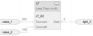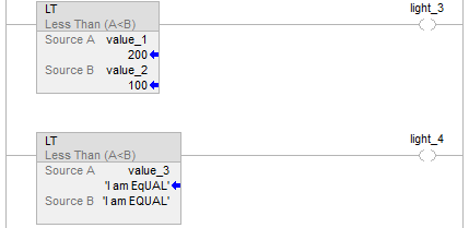 Rung-condition-in is true | Numeric compare: If Source A and Source B are not NANs and Source A is less than Source B. Set Rung-condition-out to true else Clear Rung-condition-out to false. |