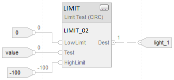 Rung-condition-in is true | See LIMIT Flow Chart (True) If output is true Set Rung-condition-out to true. else Clear Rung-condition-out to false. |