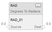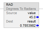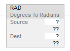 When enabled, the RAD instruction converts the Source (in degrees) to radians and stores the result in the Destination.