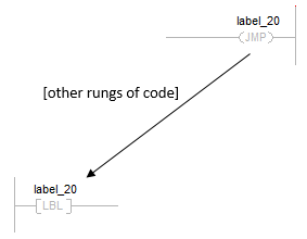 When the JMP instruction is enabled, execution jumps over successive rungs of logic until it reaches the rung that contains the LBL instruction with label_20.