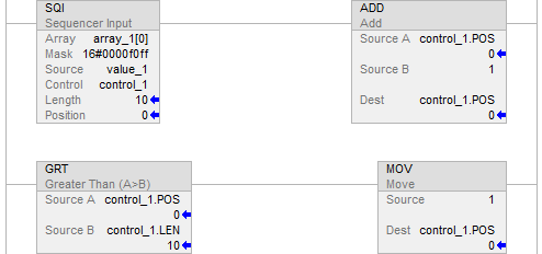 When true, the SQI instruction passes the Source and current Array element through the Mask. The results of these masking operations are compared and if they are equal, rung-condition-out is set to true, otherwise rung-condition-out is cleared to false. Typically use the same CONTROL structure as the SQO and SQL instructions.
