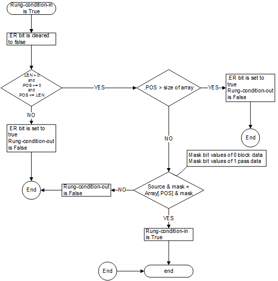 The rung-condition-in will be set to true when the instructions enableOut will be true when the result of ANDing the array value specified by the Position e.g. Array[Position] with the Mask value is equal to the result of ANDing the Source value with the Mask value, otherwise the rung-condition-out will be cleared to false.
