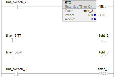 When limit_switch_7 is set, light_2 is on for 180 milliseconds (timer_3 is timing). When timer_3.acc reaches 180, light_2 goes off and light_3 goes on. Light_3 remains on until timer_3 is reset. If limit_switch_7 is cleared while timer_3 is timing, light_2 goes off. When limit_switch_8 is set, the RES instruction resets timer_3 (clears status bits and .ACC value).