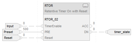 Set the Reset input parameter to reset the instruction. If TimerEnable is set when Reset is set, the RTOR instruction begins timing again when Reset is cleared.