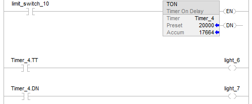 When limit_switch_10 is set to true, light_6 is on for 20000 milliseconds (Timer_4 is timing). When Timer_4.acc reaches 20000, light_6 goes off and light_7 goes on. If limit_switch_10 is cleared to false while Timer_4 is timing, light_6 goes off. When limit_switch_10 is cleared to false, Timer_4 status bits and .ACC value are reset.