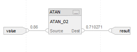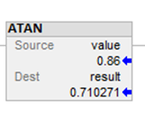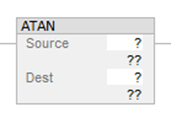 Rung-condition-in is true | Set Rung-condition-out to Rung-condition-in. Dest = arc tangent value of the Source. |