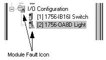 The I/O Configuration Folder (top level) displays the Module Fault Icon if a module below it is faulted; it does not display the Module Fault Icon if the module is inhibited, waiting, etc.