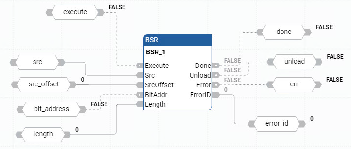 BSR 指令是 false-true 梯级转换时的即时进程,并同步更新输出。当 Execution 为 TRUE 时,将最右侧位(元素的第 0 位,通过 Src + SrcOffset 寻址)复制到 Unload 位,并且数组或非数组中的所有位向右移一位。考虑 Length 和 16 位边界,BOOL 数据类型除外。然后,外部位移动到第一个元素的 0 位 (Src + SrcOffset)。