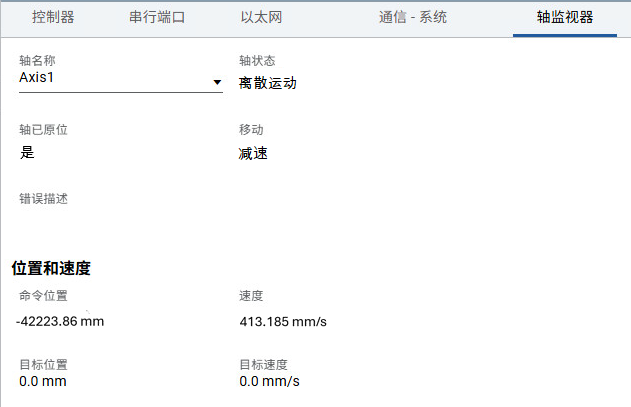 - 轴状态更改为“离散运动”,直到速度变为零。当速度达到零时,Done 将设置为 True,并且轴状态更改为“静止”。