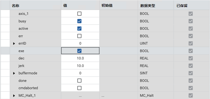 Deceleration | 输入 | REAL | 减速的值(始终为正值)(减少电机的能量)。 如果 Deceleration <= 0 且轴未处于“静止”状态,则 MC_Halt 将被设置为 MC_FB_ERR_RANGE。 |