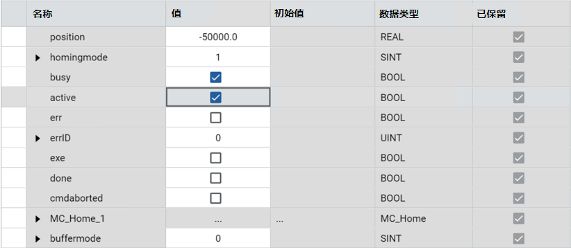 - 发布 MC_Power 后,轴 Homed 状态会重置为 0(未归位)。多数情况下,轴接通电源后,需要执行 MC_Home 功能块,才可以校准轴位置和归位参考。