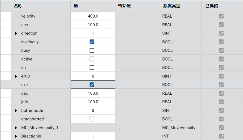 - 要停止或更改 MC_MoveVelocity 启动的运动,必须使用其他指令块(包括使用不同参数重新执行 MC_MoveVelocity)来中断或覆盖该指令块。