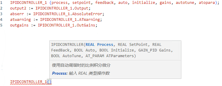 (* ST equivalence: IPIDController1 is an instance of IPIDController block *) IPIDController1(Proc, SP, FBK, Auto, Init, G_In, A_Tune, A_TunePar, Err ); Out_process := IPIDController1.Output ; A_Tune_Warn := IPIDController1.ATWarning ; Gain_Out := IPIDController1.OutGains ;