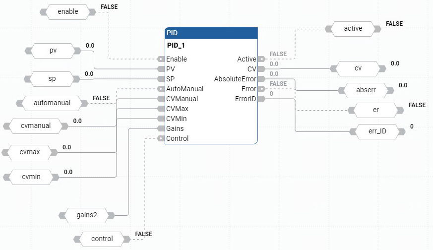 - 在启用后,PID 将使用包括 PID 控制器的 SP 和 Gains 在内的输入参数来控制过程。