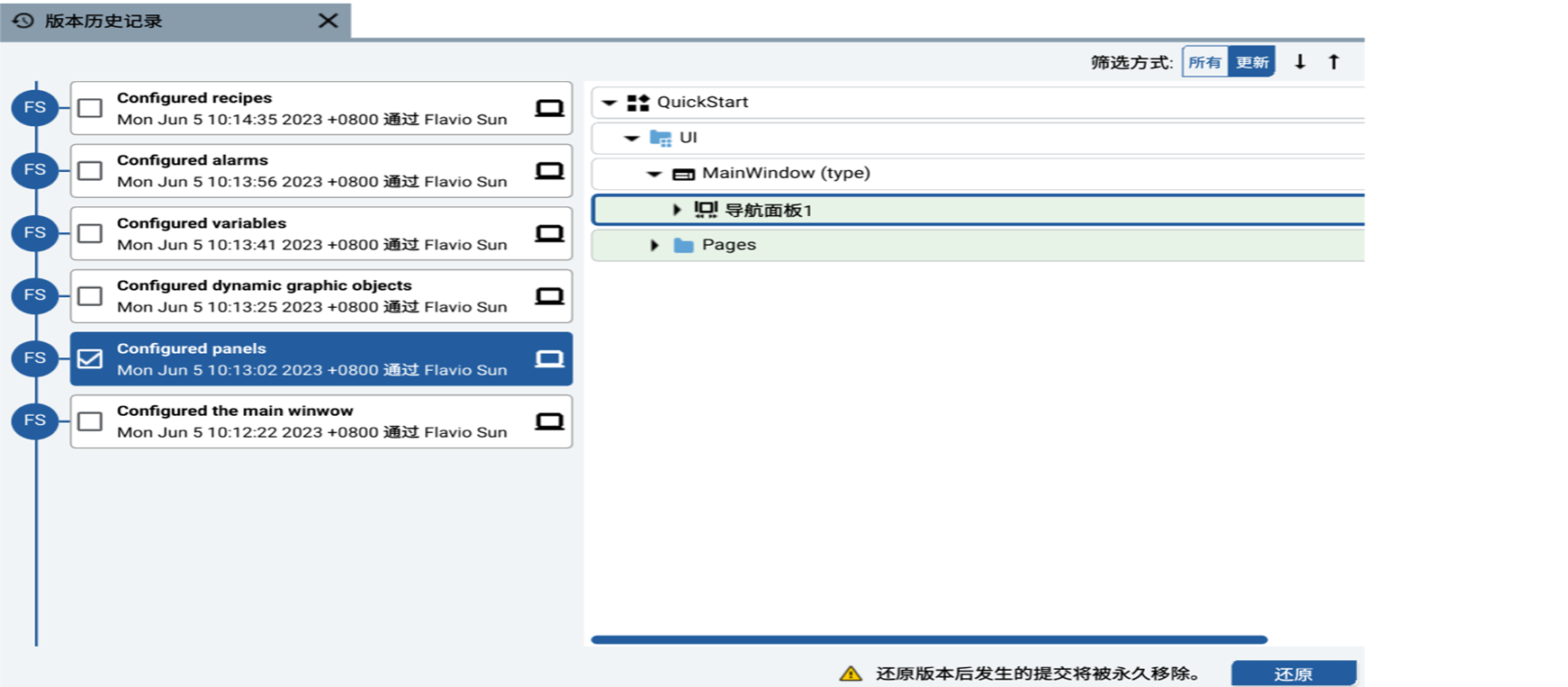 要查看提交历史记录并将项目还原到某次提交,请选择