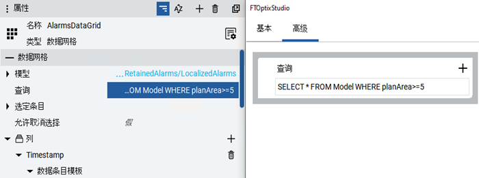 小组件显示所有已启用的报警和处于活动状态的报警。查询会在运行时筛选报警,以便仅显示某些报警。示例查询可以在运行时筛选报警,以便仅列出来自 Plant Area 5 的如下报警: