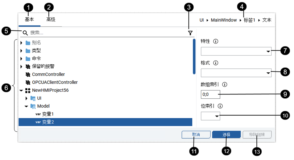 动态链接浏览器的内容取决于打开浏览器的变量的数据类型,以及在浏览器中选择的变量。例如,仅当打开浏览器的变量的字符串为 LocalizedText 数据类型时,才会显示