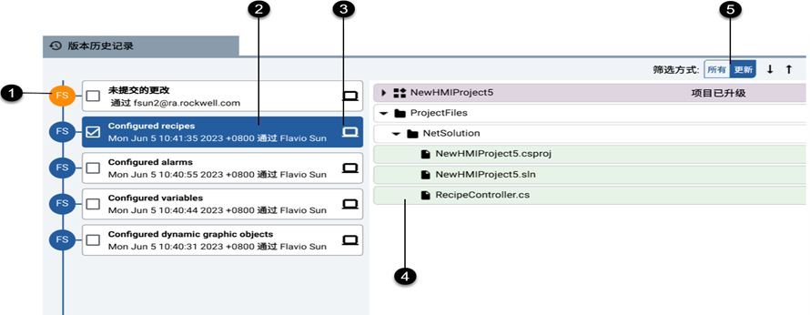 ![]() | 提交消息和详细信息 | 提交内容,其中包含所做更改的说明以及提交日期和时间。选择 可选择提交内容并查看其中的更改。 |