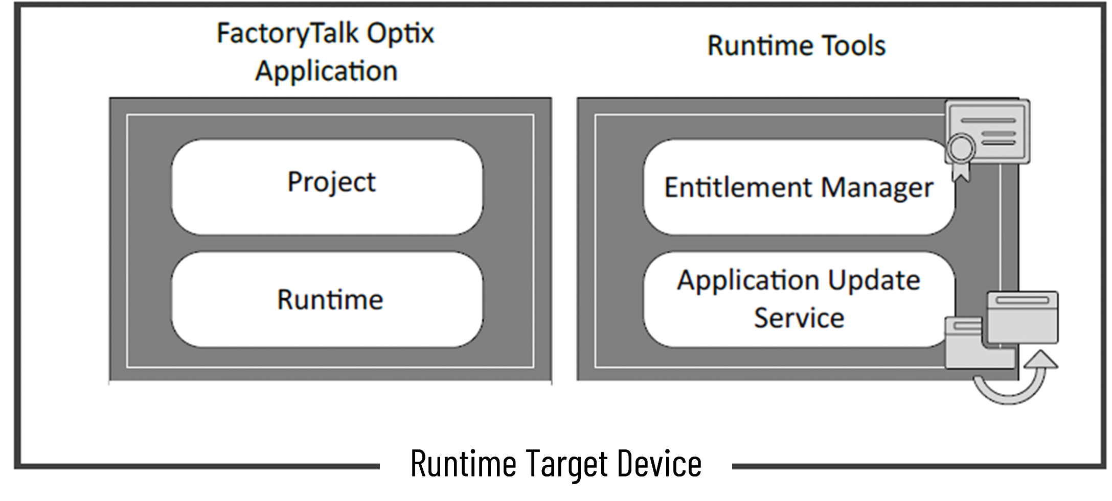 - FactoryTalk® Optix™Runtime - 在目标设备上安装 Runtime Tools 时可以选择的服务。Runtime 在 Runtime 目标设备上将FactoryTalk® Optix™应用程序作为服务运行。