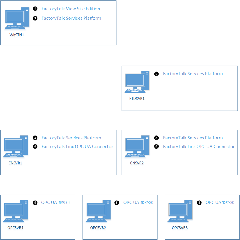 ![]() | 配置为客户端的 FactoryTalk Services Platform | WKSTN1、CNSRV1 和 CNSRV2 | FactoryTalk Administration Console |