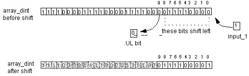 使能后,指令将指定位的最高位卸载到 .UL 位,将其余的位左移一位,并将位地址加载到 Array 的位 0。