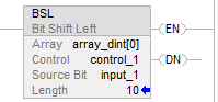 使能后,BSL 指令从 array_dint[0] 中的位 0 开始执行。指令将 array_dint[0].9 的值卸载到 .UL 位,将其余的位移位,并将 input_1 的值加载到 array_dint[0].0 中。其余的位 (10-31) 将无效。
