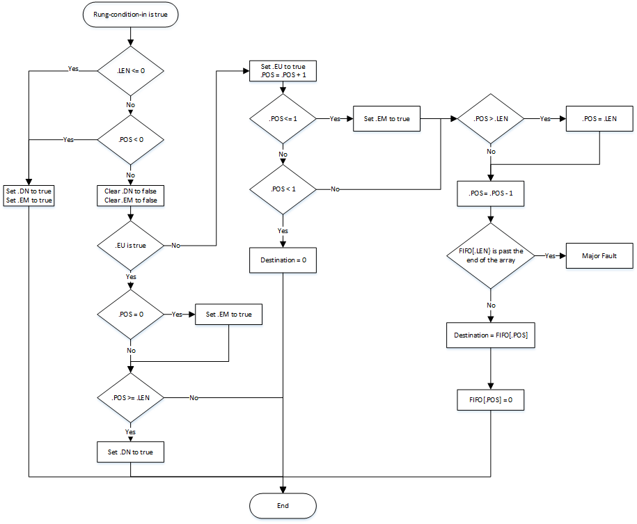 使能后,LFU 指令会卸载 LIFO 中 .POS 处的值,并将该值放入 Destination。指令在每次使能后都将卸载一个值并将其替换为 0,直到 LIFO 为空。如果 LIFO 为空,LFU 会将 0 返回到 Destination。