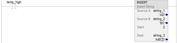 Start | SINT DINT INT | 立即数标签 | Source A 中要添加字符的位置 | 输入介于 1 与 Source 的 DATA 大小之间的数值。 |