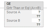 EnableIn 为真 | 数值比较: 将 EnableOut 设为 EnableIn 如果 SourceA 和 SourceB 不是 NAN 且 SourceA 大于等于 SourceB。 将 Dest 设置为真 否则 将 Dest 设置为假。 |