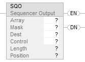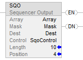当 .EN 为 true 时,SQO 指令移动 .POS 处的数组数据使其经由 Mask 屏蔽码处理,然后移动当前 Destination 值使其经由 Mask 补码处理。对这两个运算的结果执行 OR 运算,结果存储在 Destination 中。