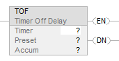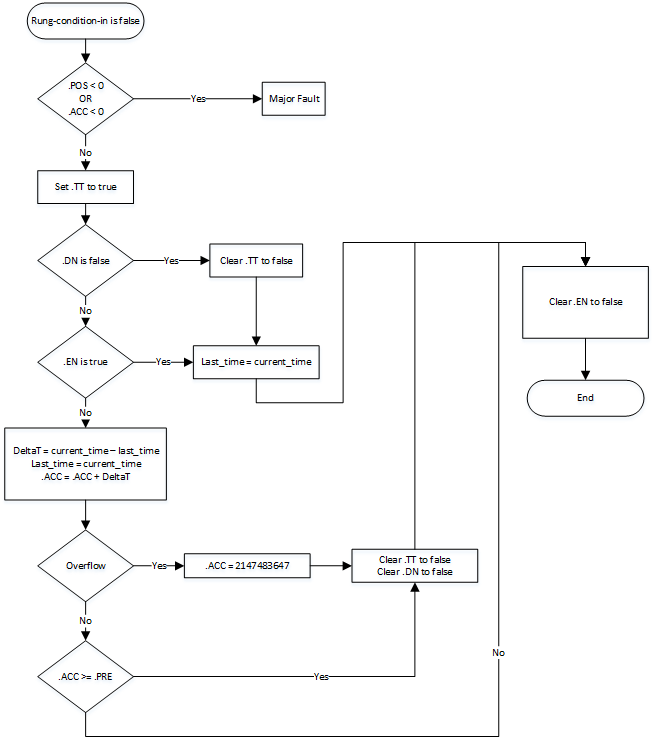 梯级输入条件为真 | 将梯级输出条件设置为梯级输入条件。 .EN 位设置为真。 .TT 位设置为假。 .DN 位设置为真。 .ACC 值清零。 |
