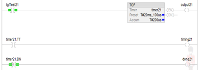 持续接通 20 毫秒 100 微秒(timer21 计时)。当 timer21.acc 达到 20 毫秒 100 微秒时,timing21 断开,done21 接通。Done21 保持接通,直到 TOF 指令使能。如果在 timer21 计时期间 tglTest21 为真,timing21 断开。提供反馈