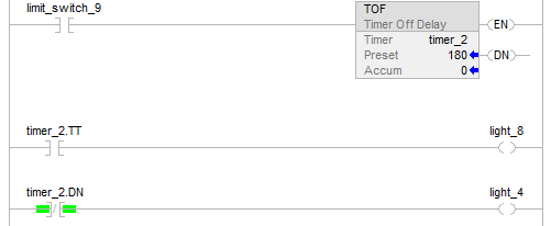 当 limit_switch_9 清零时,light_8 接通并持续 180 毫秒(timer_2 计时)。当 timer_2.acc 达到 180 时,light_8 断开,light_4 接通。Light_4 保持接通,直到 TOF 指令使能。如果在 timer_2 计时期间 limit_switch_9 为真,则 light_8 断开。