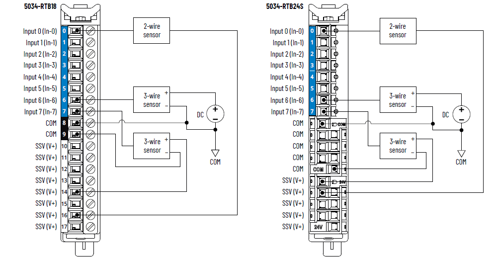 要建立更多的 COM/V+ 连接,请使用 5034-RTB24S,或在模块旁边安装 5034-MBPTM 或 5034-MBPTMXT。