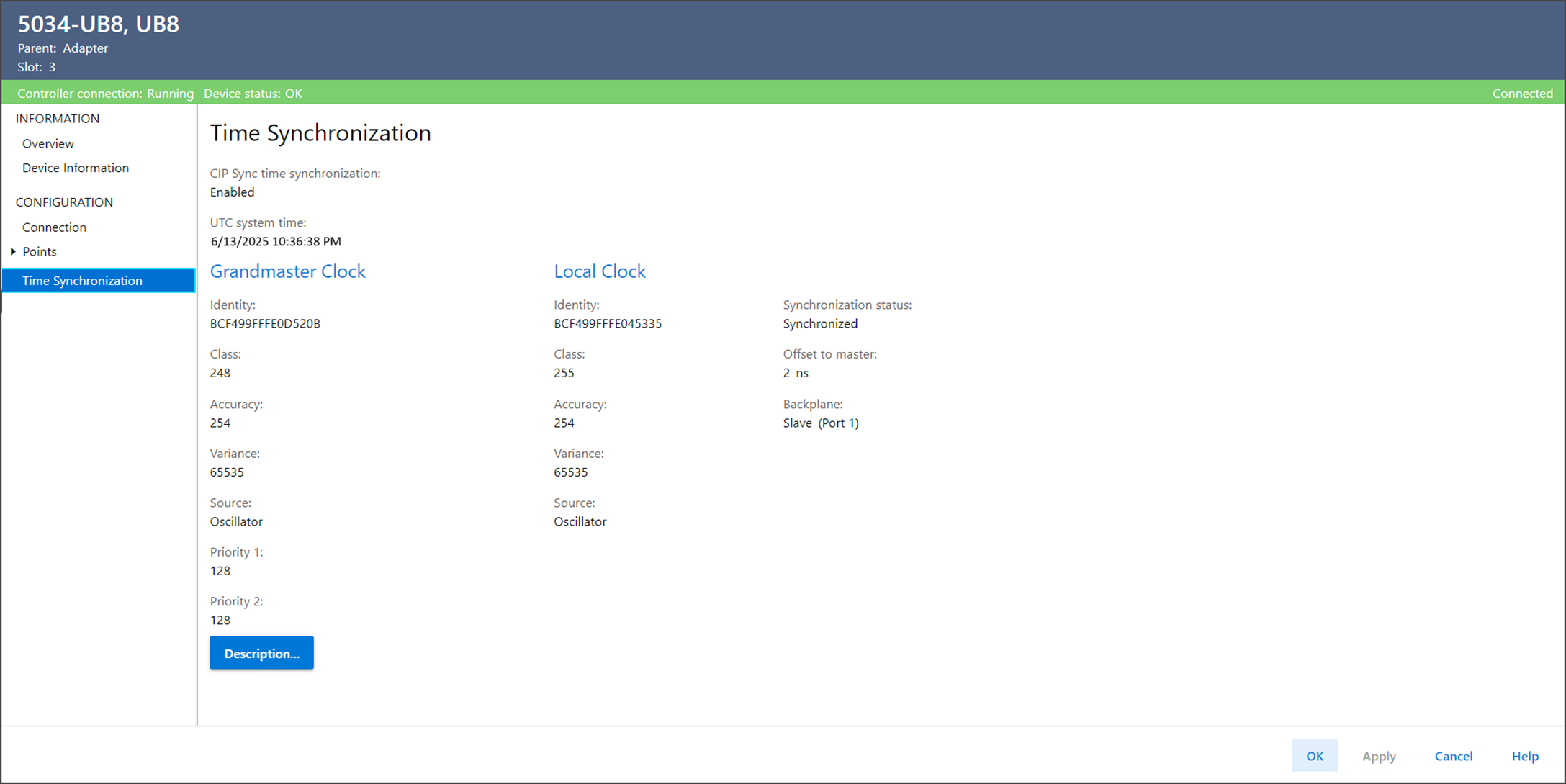 主时钟描述对话框提供有关主时钟的详细信息。 要查看主时钟描述,在 Time Sync 视图中选择 Description。