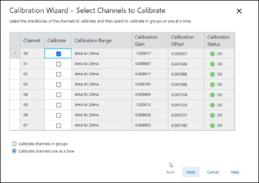 - 一次或成组选择要校准的通道,然后选择 Next。