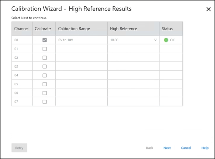 - 选择 Next。 随即会出现 High Reference Results 对话框,指示校准通道的状态。