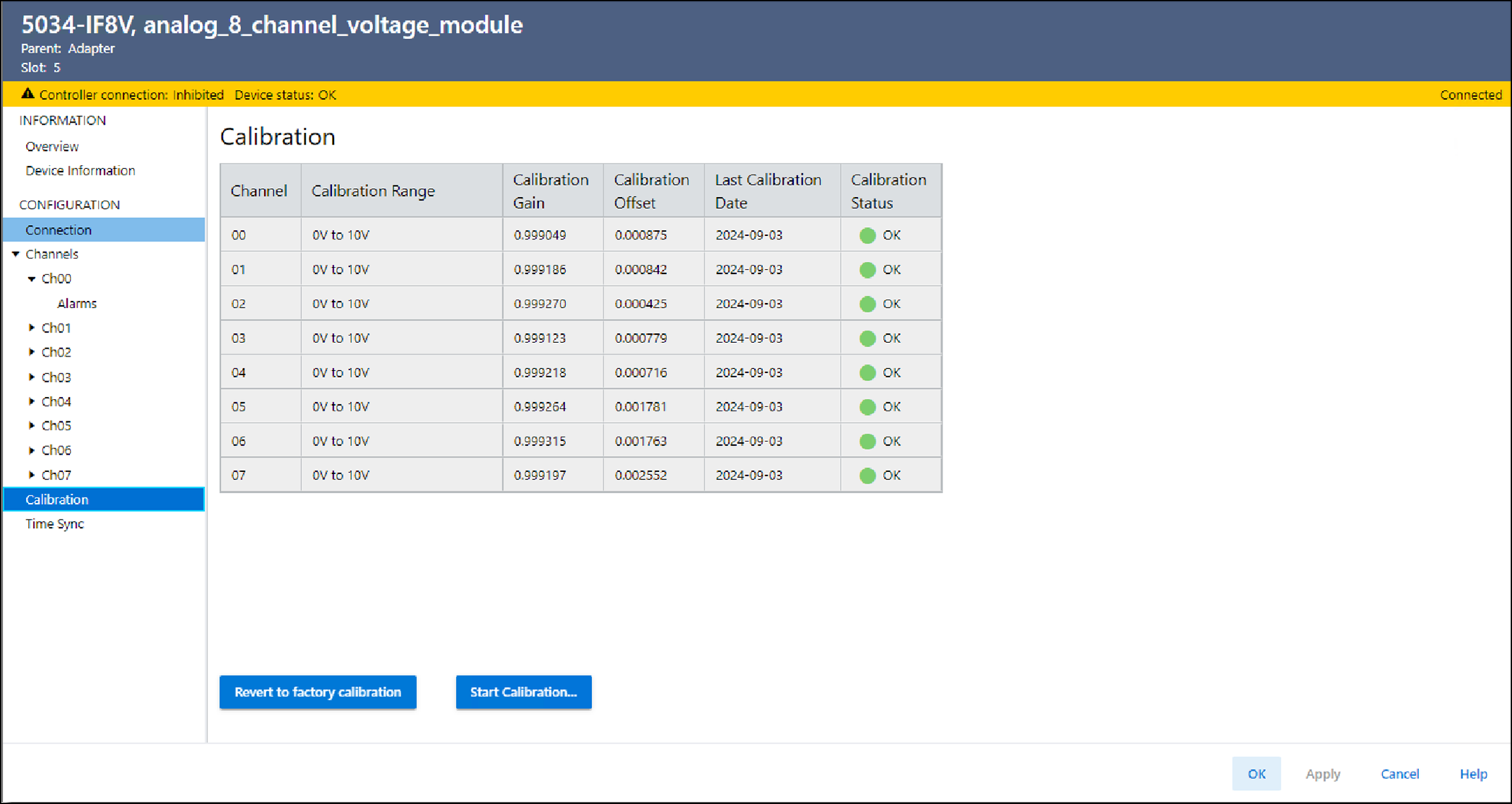 Calibration 视图提供了模块上所有通道的校准信息。 您可以在该视图上对所有通道执行以下操作: