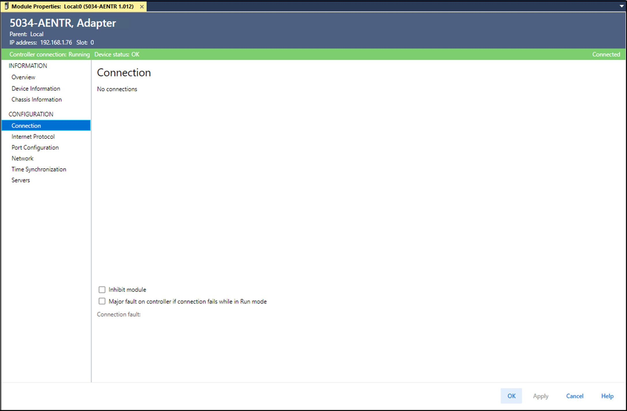 - 从 Connection 类型下拉列表中选择连接类型。连接选项说明None从控制器(发起方)到适配器无直接连接。Status报告设备状态。