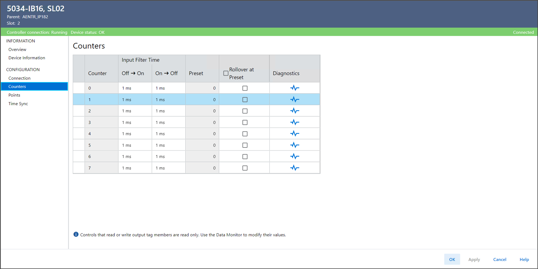 Counters 显示了各计数器可用的配置选项。 根据您选择的 Input Filter Time 选项,输入滤波时间的 Off→On 和 On→Off 切换次数将相应改变。 您还可以在“预设值”时启用 Rollover。 要修改计数器预设值,在控制器标签中使用