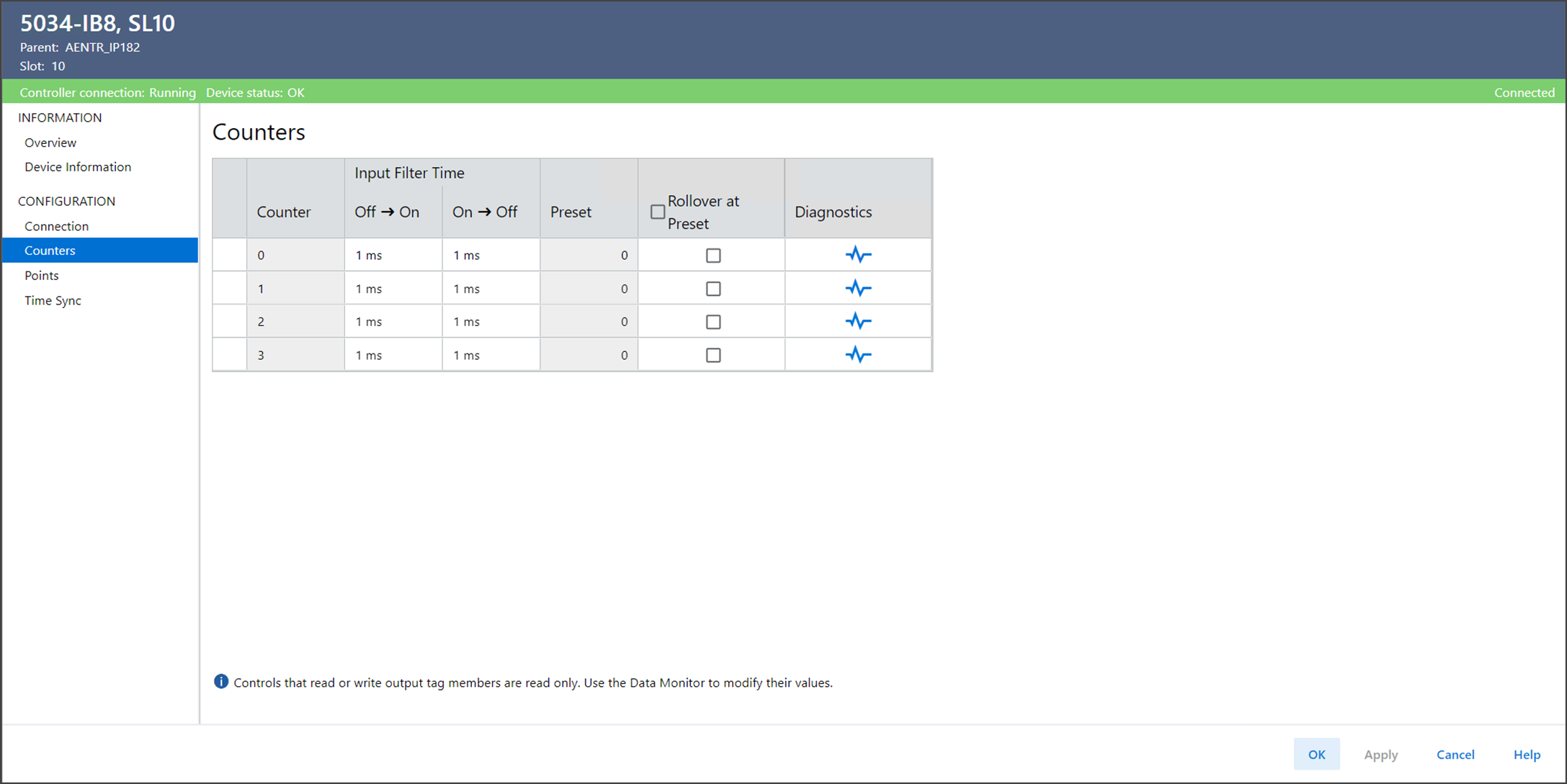 Counters 显示了各计数器可用的配置选项。 根据您选择的 Input Filter Time 选项,输入滤波时间的 Off → On 和 On → Off 切换次数将相应改变。 您还可以在“预设值”时启用 Rollover。 要修改计数器预设值,在控制器标签中使用