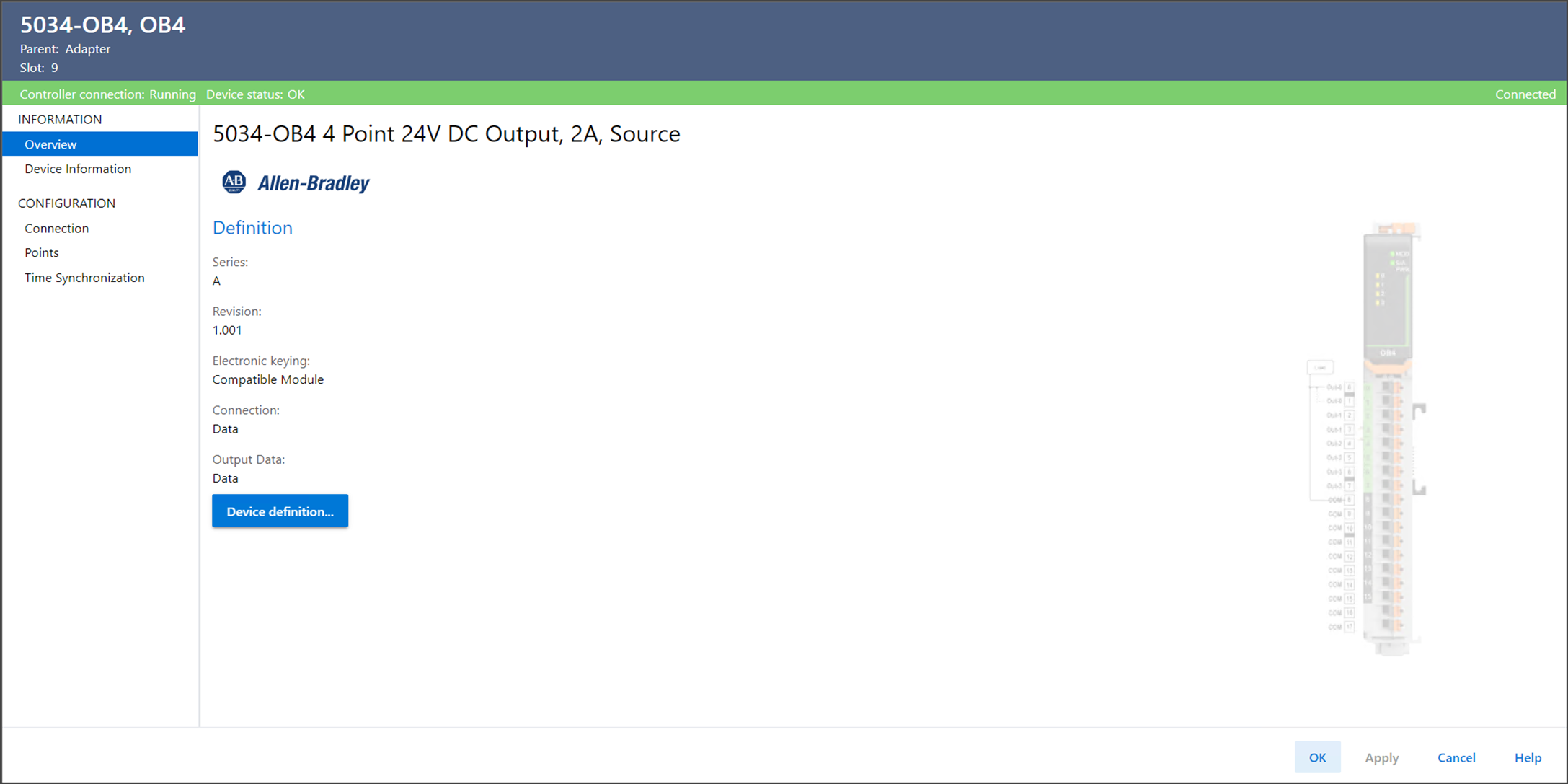 Connection | 指定设备和控制器之间传输的数据类型。 对于 Listen Only Data 选项,控制器和设备建立通信,控制器不向设备发送任何配置或输出数据。