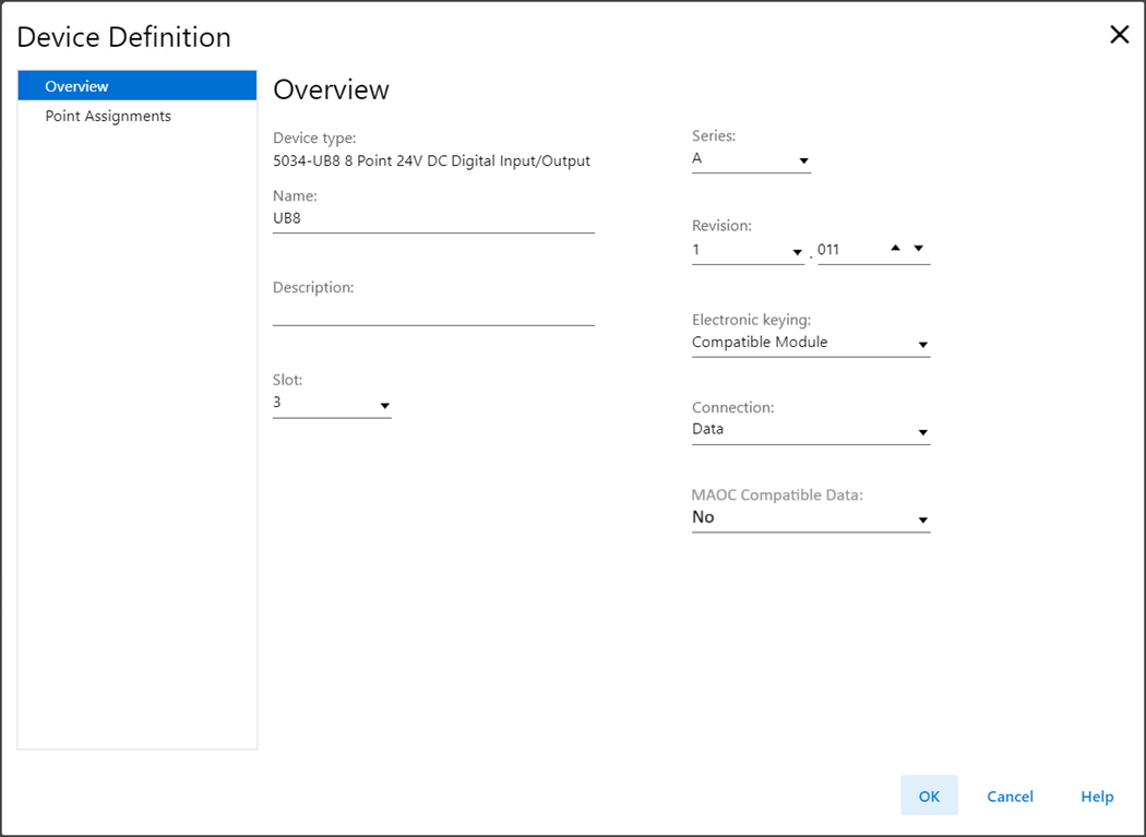 MAOC Compatible Data | 指定数据与开启运动凸轮输出 (MAOC) 指令是否兼容。 如果数据与 MAOC 不兼容,则无法通过 MAOC 指令使用该模块。 选择 Yes 时,某些点分配选项不可用。 |