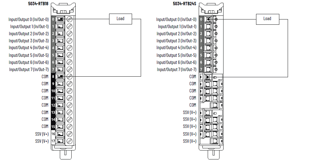 要建立更多的 COM/V+ 连接,尤其是在混合输入/输出配置下,请使用 5034-RTB24S,或在模块旁边安装 5034-MBPTM 或 5034-MBPTMXT。