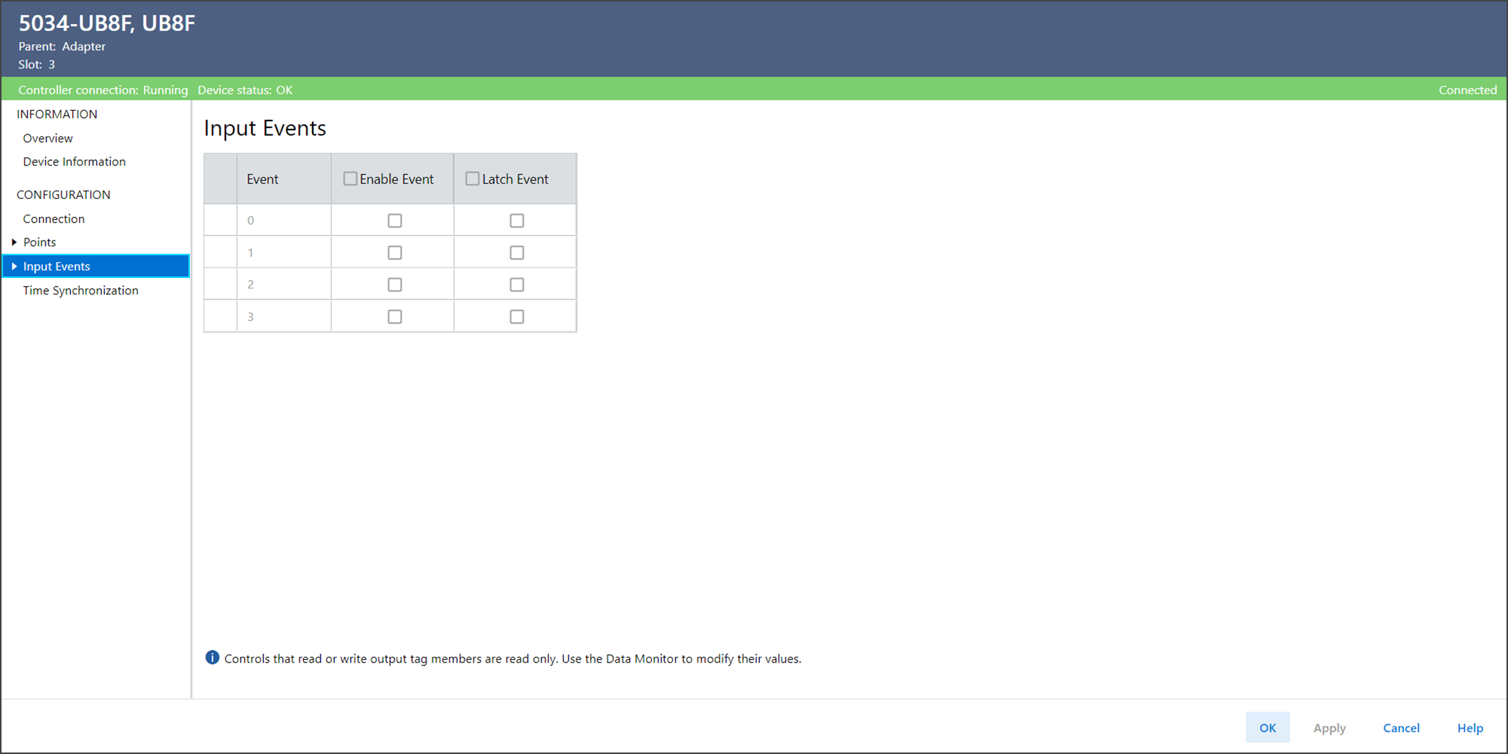 Input Events 视图显示了所有输入事件的配置值概览。只能在项目在线时执行某些任务。