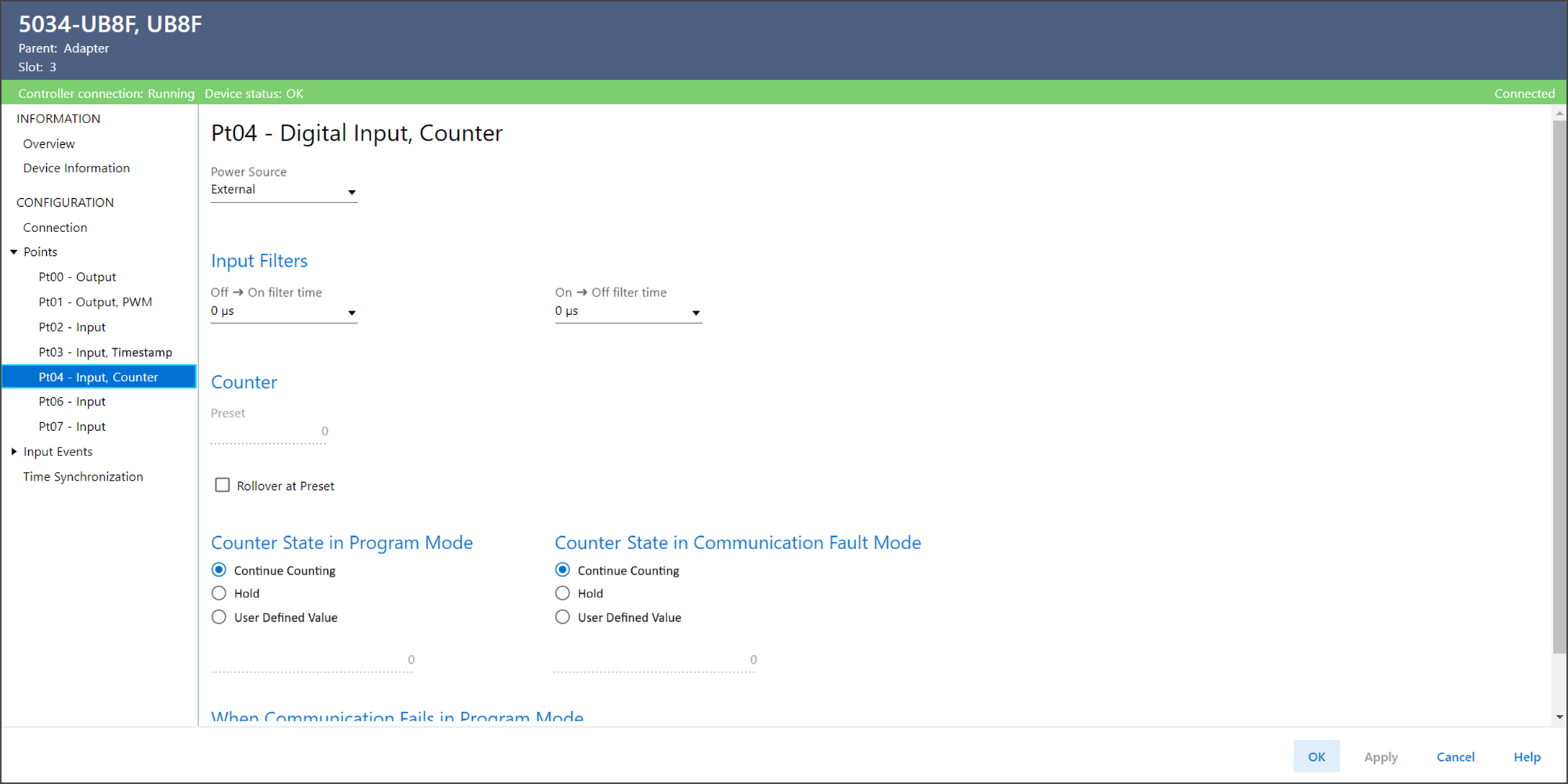 使用 Ptxx – Digital Input, Counter 查看或配置设备的点。
